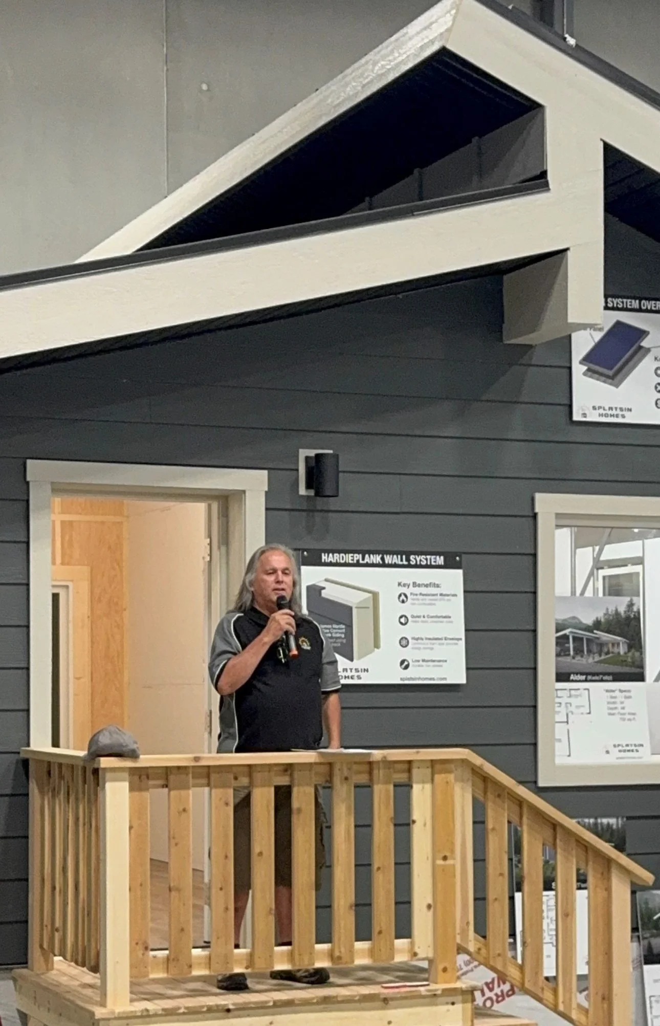 Kukpi7 Mike Christian addresses the crowd and media during the grand opening of Splatsin Homes — an Indigenous-led housing initiative showcasing innovation, sustainability, and community-driven solutions.